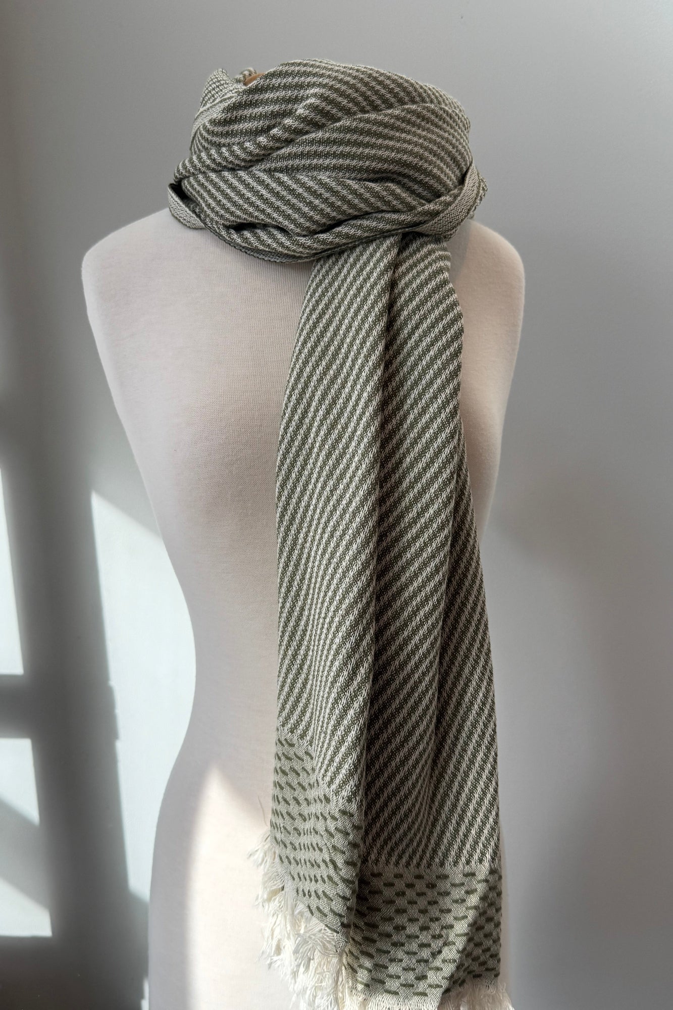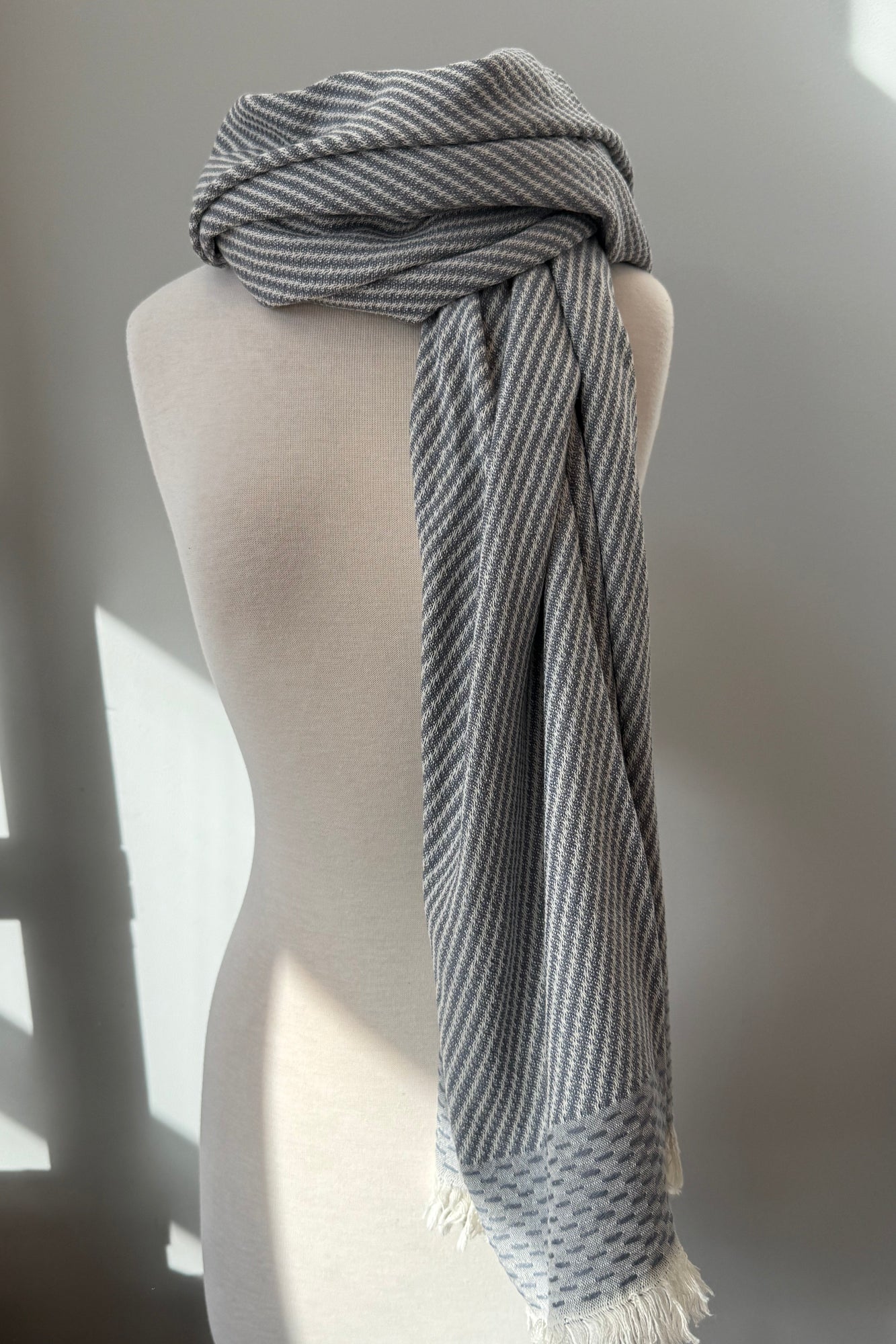 A diagonal pattern with a thoughtful border and a sweet little natural fringe, giving it some dimension. This uber-soft towel is an all star that can be used as easily on the beach as a train or in your home!